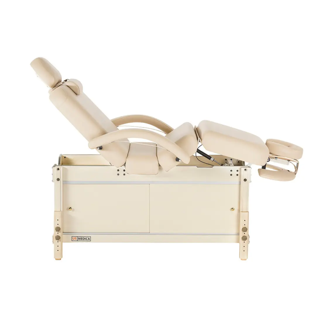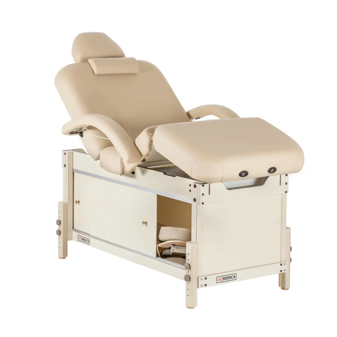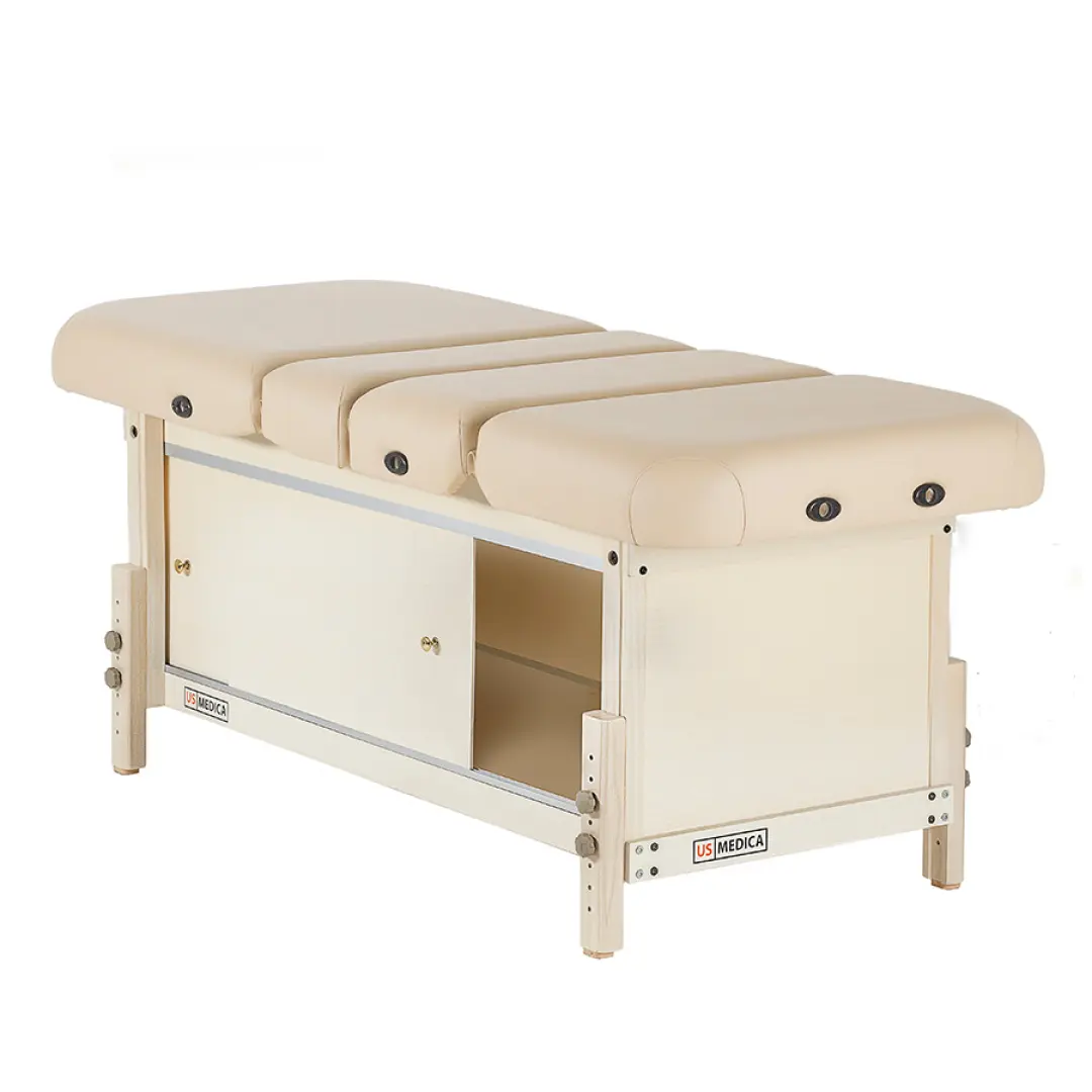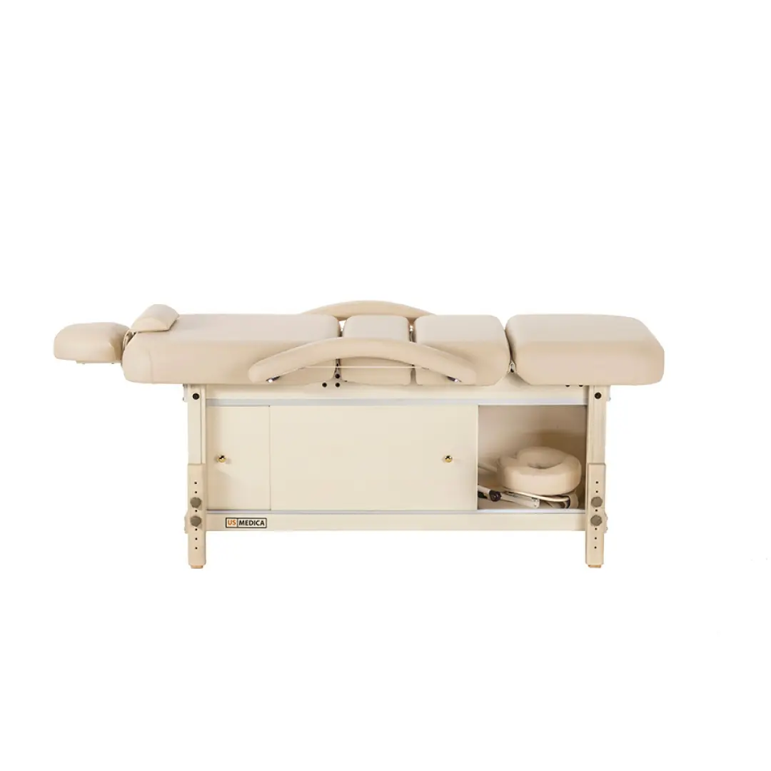 В любом кабинете массажиста, будь то в массажном салоне или частном кабинете профессиональный стационарный массажный стол должен гармонировать с обстановкой и вызывать чувство комфорта. Функциональные возможности массажного стола US Medica Bali отвечает всем этим требованиям и придётся по вкусу даже самому требовательному клиенту. Особенностью стола US Medica «Bali» являются удобные решения его дизайна. К примеру, специальная тумба для хранения аксессуаров станет придётся кстати для специалиста широкого профиля, которому всегда нужно иметь под рукой множество атрибутов для массажа. Благодаря уникальным разработкам специалистов US Medica, массажный стол оснащен подушкой для подголовника ComfortEye, и удобной складной полкой U-Shape, что делает массажа еще более комфортным как для пользователя, так и для массажиста.